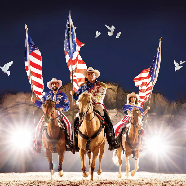 Dinner show at Dolly Parton’s Stampede includes stunts, aerial performances, competitions, musical performances, and a four-course dinner consisting of